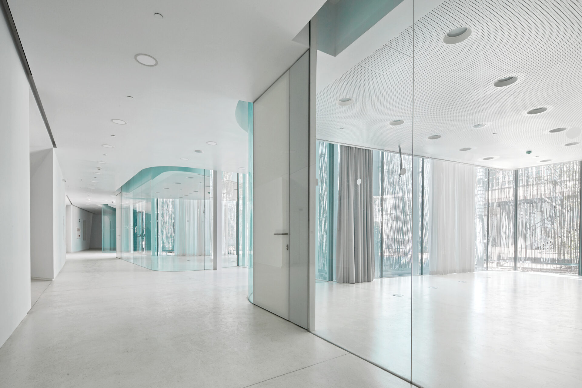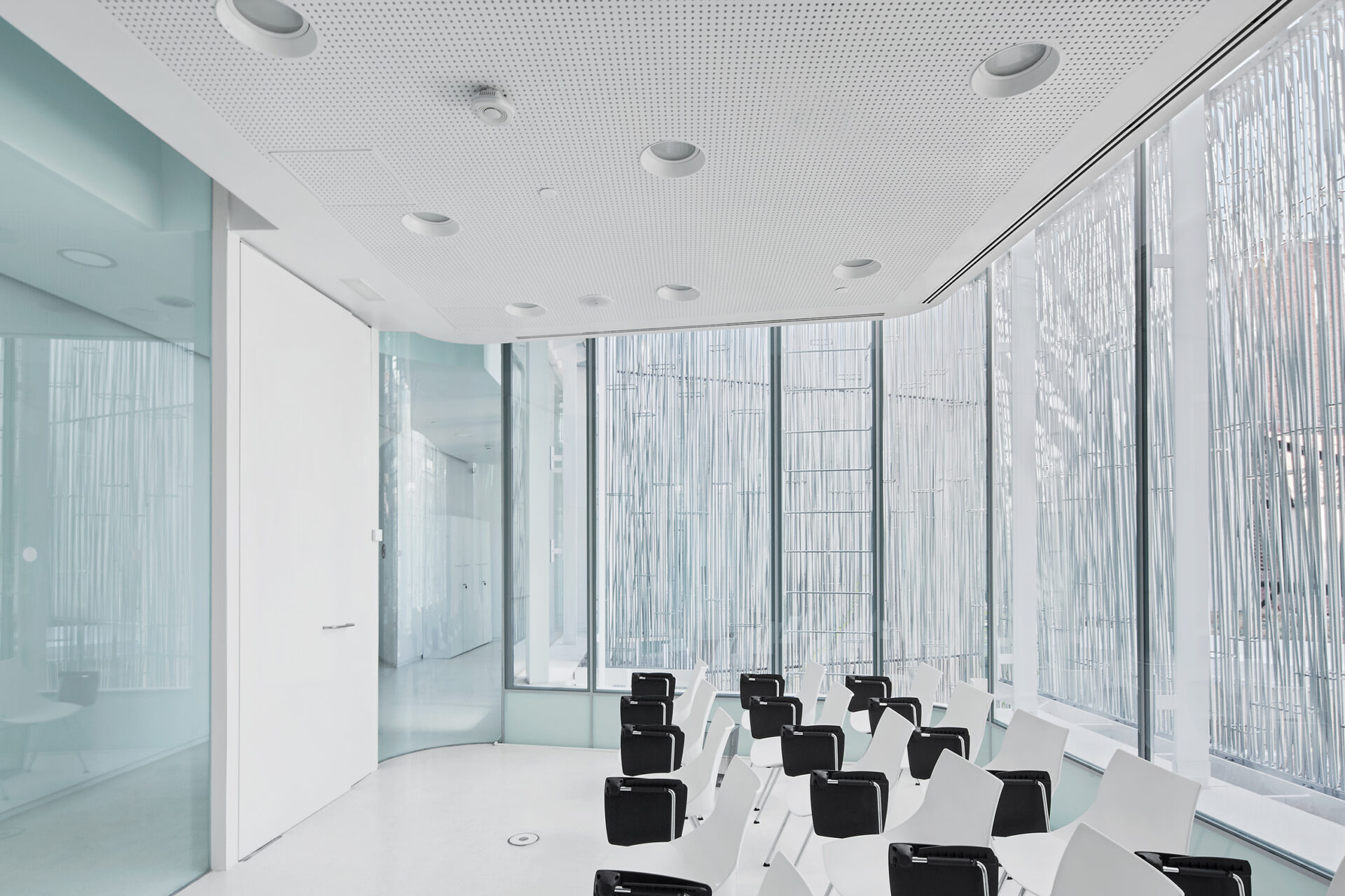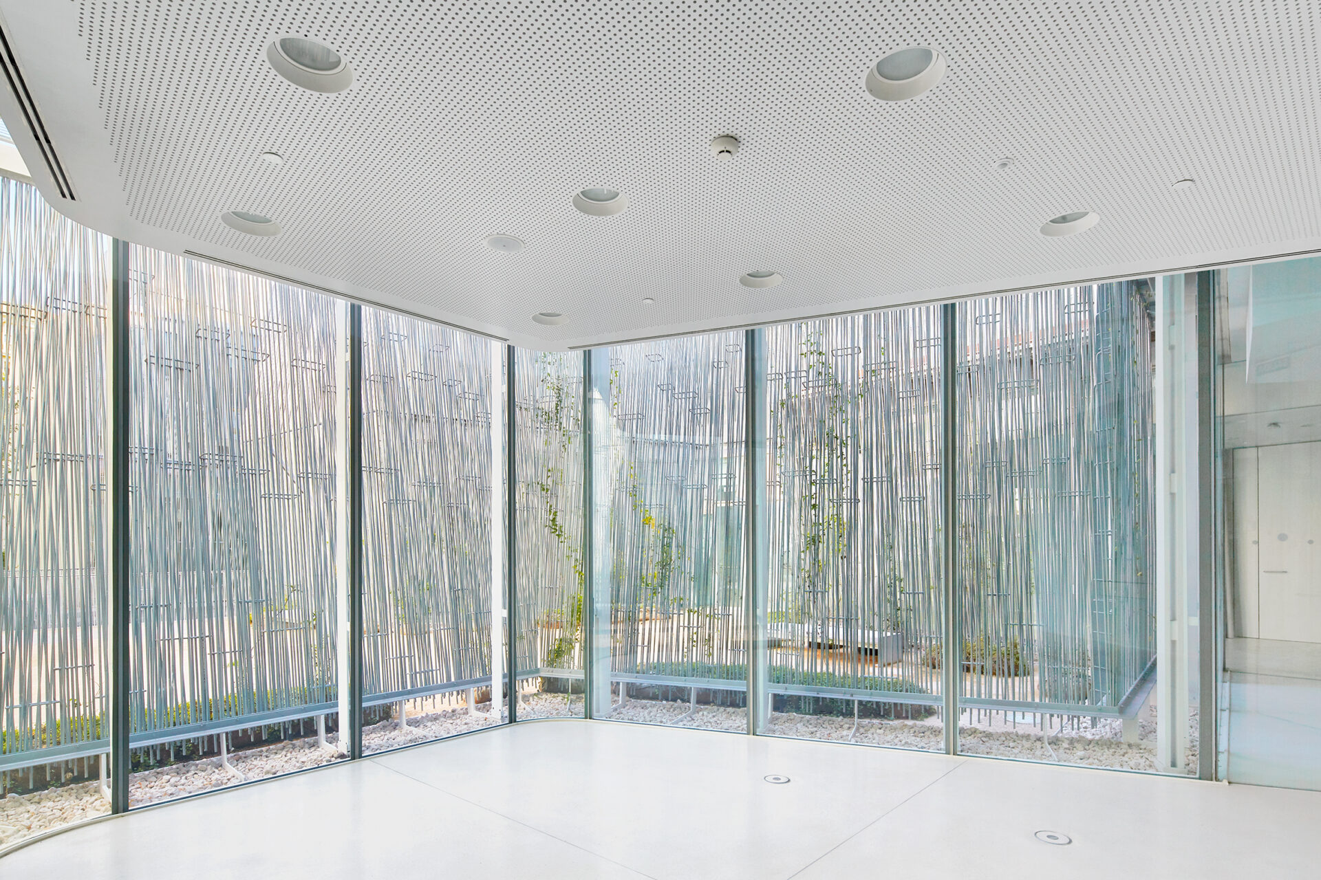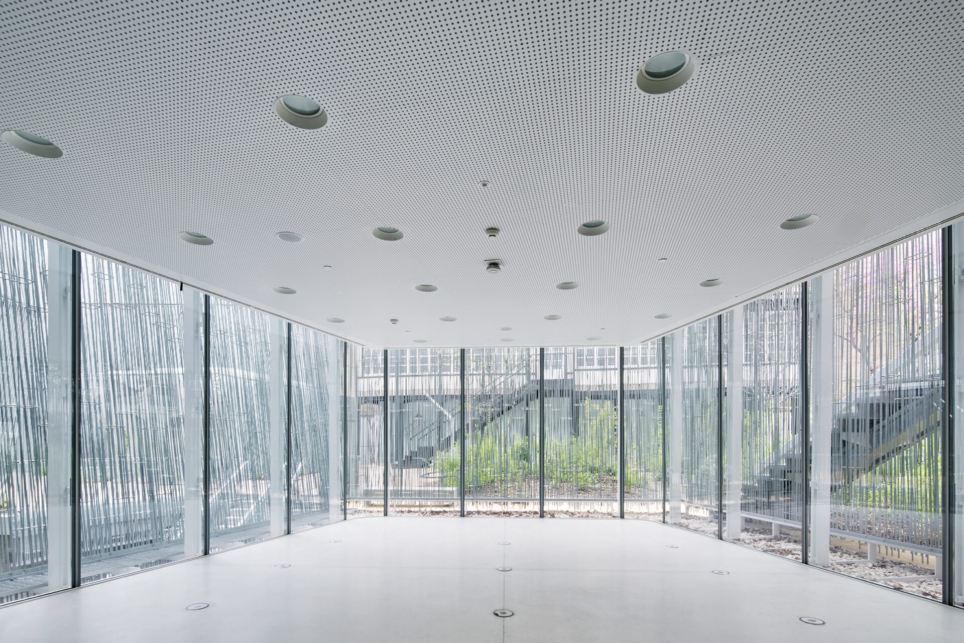 Situada en el primer sótano, frente al auditorio, la sala cuenta con acceso directo desde el jardín y está dividida en dos espacios diáfanos sin ángulos muertos, que pueden funcionar como un solo espacio o como dos independientes. Las condiciones de temperatura y humedad relativa pueden controlarse en función de las necesidades específicas.
