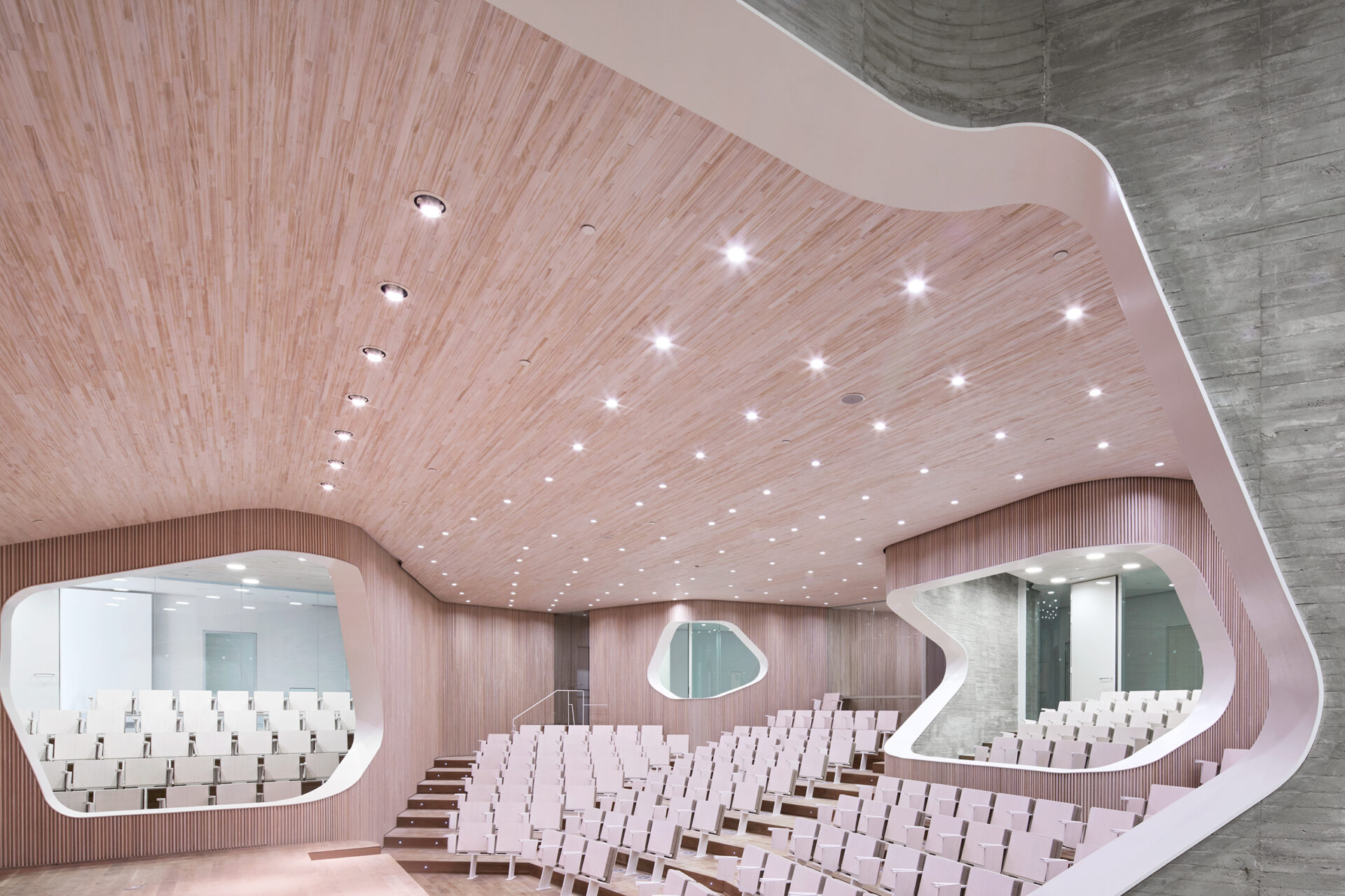 El auditorio, situado en la planta -1 del nuevo edificio, ocupa una superficie de 195 m² y dispone de 256 butacas con pala y de 6 plazas para sillas de ruedas.